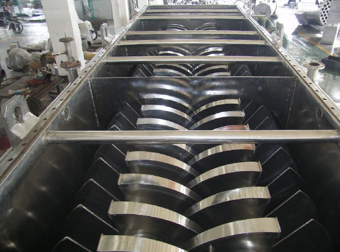 空心軸上密集排列著楔型中空槳葉,熱介質(zhì)經(jīng)空心軸流經(jīng)槳葉。單位有效容積內(nèi)傳熱面積很大,熱介質(zhì)溫度從-40℃到320℃,可以是水蒸汽,也可以是液體型:如熱水、導(dǎo)熱油等。間接傳導(dǎo)加熱,沒有攜帶空氣帶走熱量,熱量均用來加熱物料。熱量損失僅為通過器體保溫層向環(huán)境的散熱。楔型漿葉傳熱面具有自清潔功能。物料顆粒與楔型面的相對運動產(chǎn)生洗刷作用,能夠洗刷掉楔型面上附著物料,使運轉(zhuǎn)中一直保持著清潔的傳熱面。漿葉干燥機的殼體為Ω型,殼體內(nèi)一般安排二到四根空心攪拌軸。殼體有密封端蓋與上蓋,防止物料粉塵外泄而充分發(fā)揮作用。