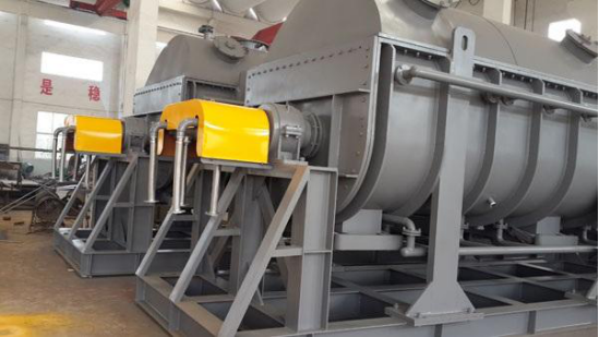 空心軸上密集排列著楔型中空漿葉,熱介質(zhì)經(jīng)空心軸流經(jīng)漿葉。單位有效容積內(nèi)傳熱面積很大,熱介質(zhì)溫度從-40℃到320℃,可以是水蒸汽,也可以是液體型:如熱水、導熱油等。間接傳導加熱,沒有攜帶空氣帶走熱量,熱量均用來加熱物料。熱量損失僅為通過器體保溫層向環(huán)境的散熱。楔型漿葉傳熱面具有自清潔功能。物料顆粒與楔型面的相對運動產(chǎn)生洗刷作用,能夠洗刷掉楔型面上附著物料,使運轉(zhuǎn)中一直保持著清潔的傳熱面。漿葉干燥機的殼體為Ω型,殼體內(nèi)一般安排二到四根空心攪拌軸。殼體有密封端蓋與上蓋,防止物料粉塵外泄而充分發(fā)揮作用。